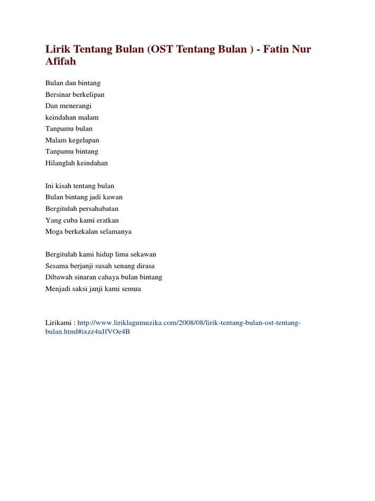 Lagu ini mengisahkan perjuangan mencari teman setia. Lirik lagu tentang bulan dari fatin afeefa. Sal priadi bulan yang baik: Malam indah bagaikan di syurga Di atas bangku dari bambu. Dengan kekuatan bulan yang paling baik harapanku besar dunia kembali asyik kelak langit terang aku b. Bulan dan bintang bersinar berkelipan.